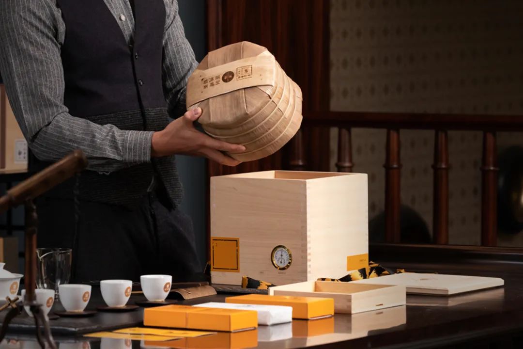 延续十二春秋®经典木箱收纳:套装涵盖了“饼、砖、沱”全部形态茶品(包括5饼500克茶饼、1份砖茶、18粒沱茶),收藏证、榫卯木箱、透气孔、分茶器、温湿度表的组合已经成为套装经典的原创细节,加入“虎尾”提绳,尽享典藏之乐。