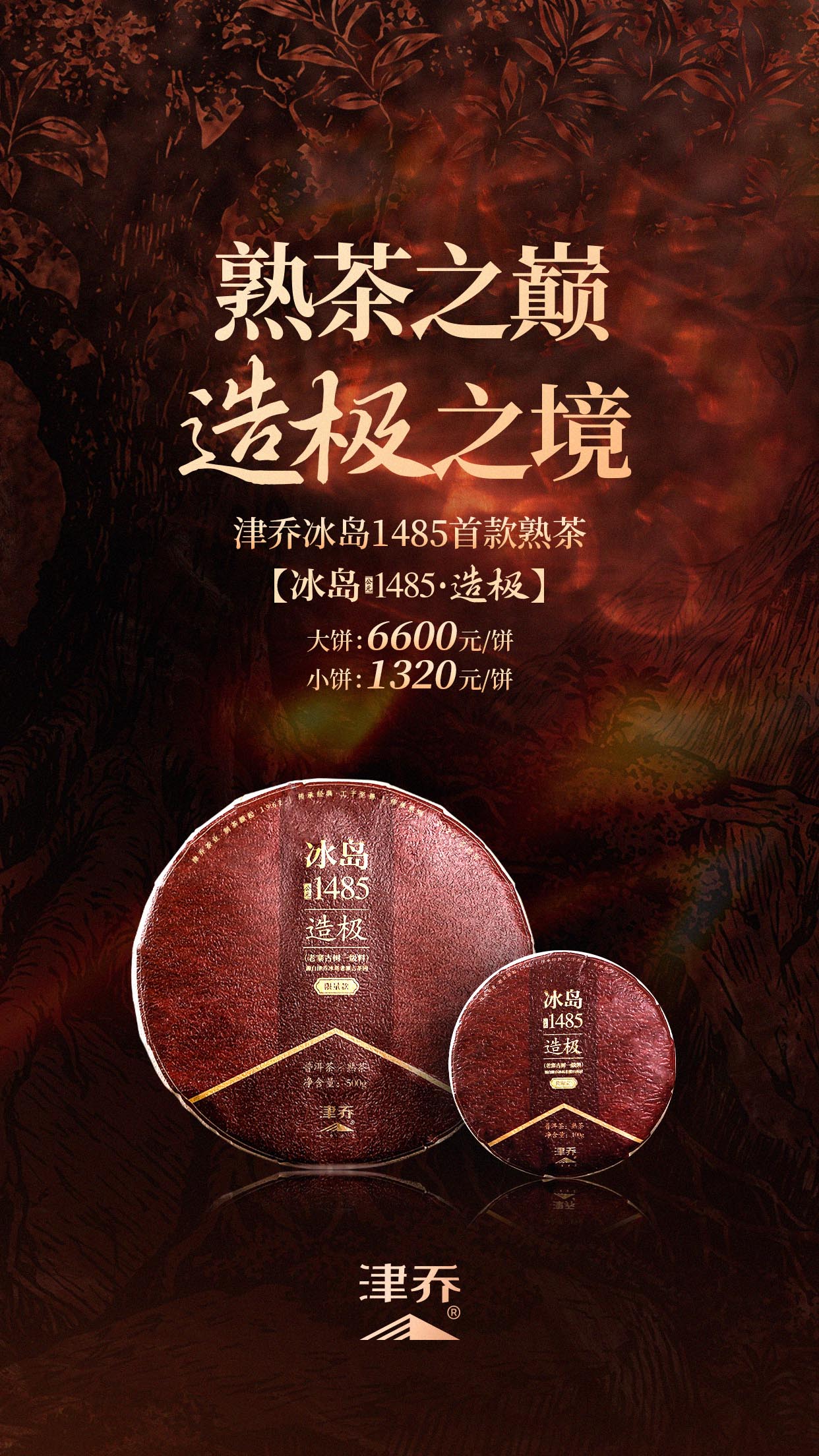 熟茶之巅,造极之境,津乔“冰岛1485·造极”饼茶版本限量推出,诚邀你藏一饼岁月,品一味极致。