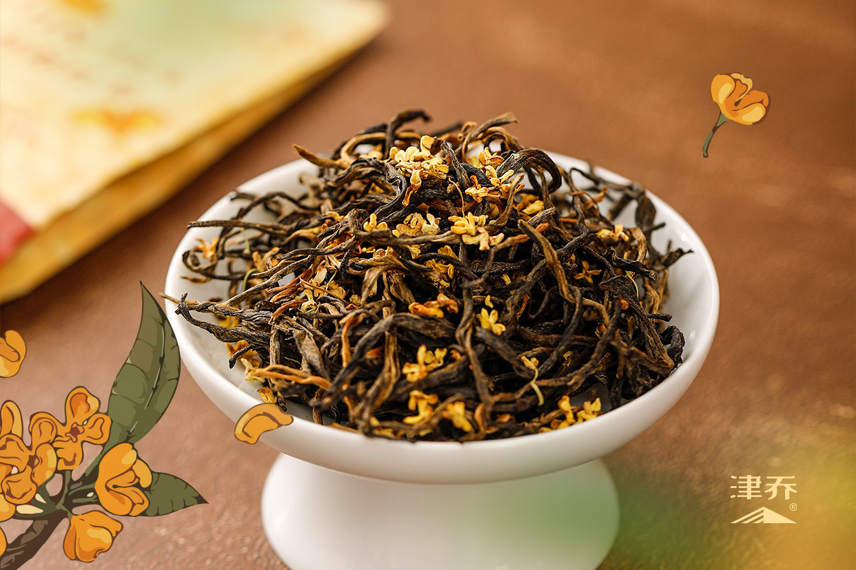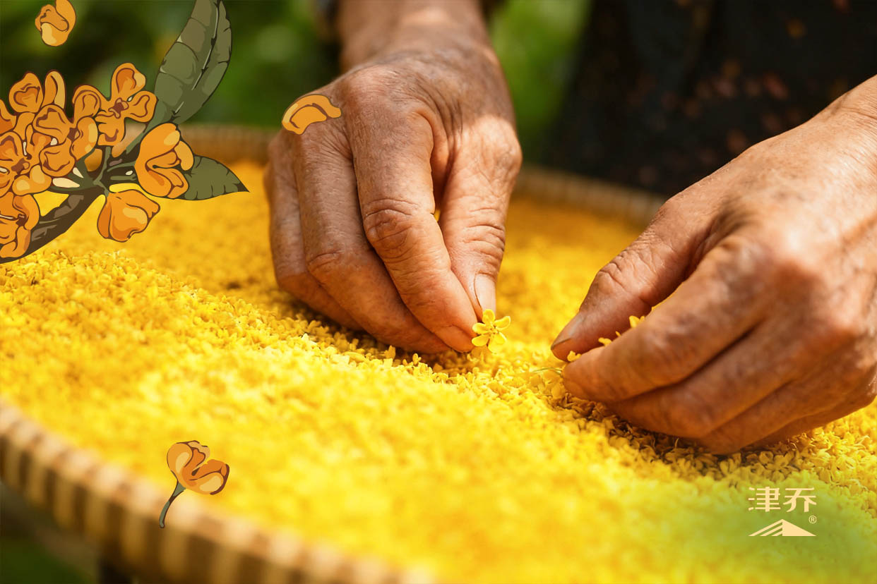 我们选用湖北咸宁的地道金桂,这里地处北纬25°,气候温润,产出的金桂花色金黄、香气浓烈,是拼配红茶的“黄金搭档”。于花事鼎盛时手工采摘,确保每朵花都饱吸秋露精华,再以津乔拼配技艺,让桂花幽芳层层沁入茶骨。