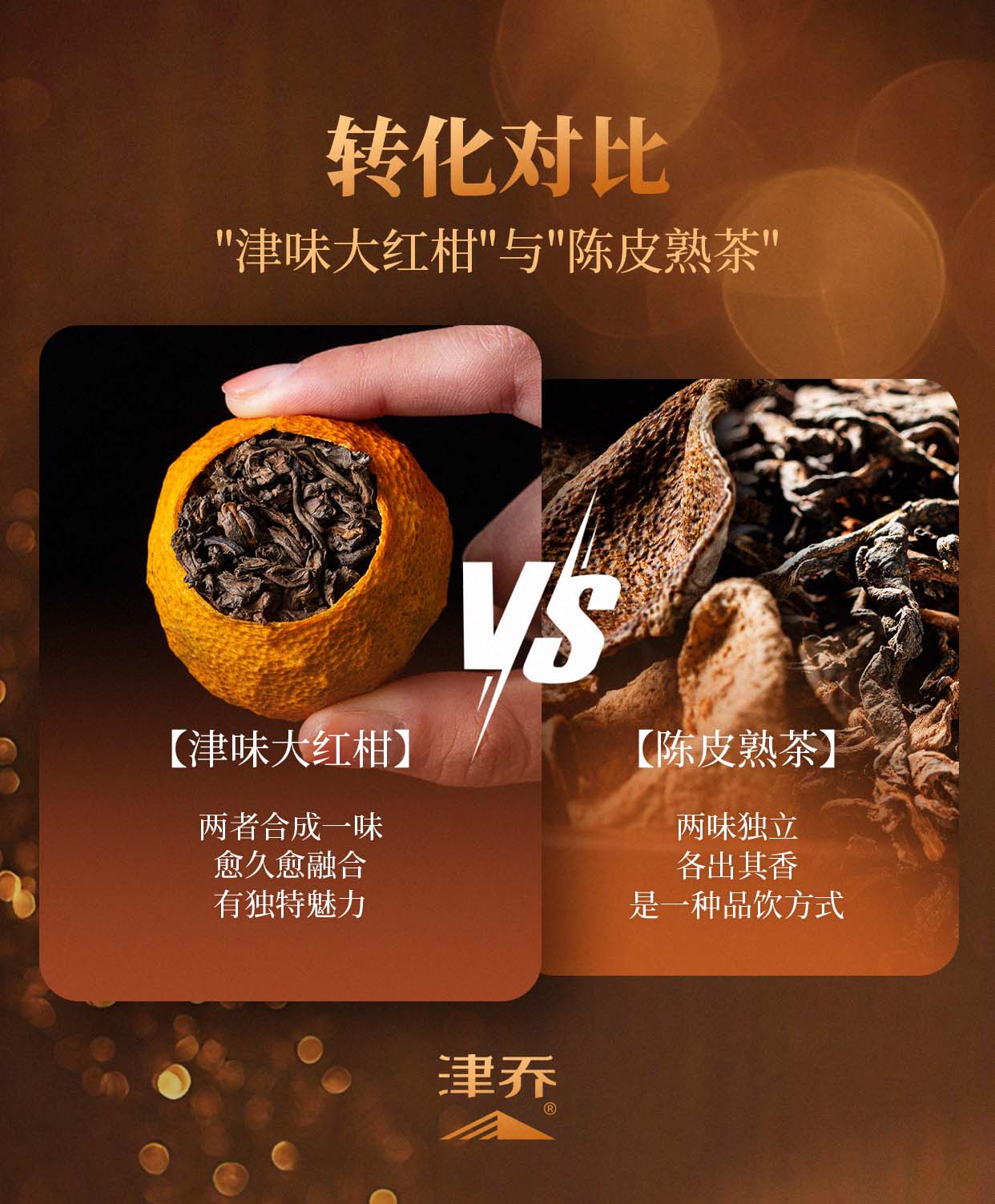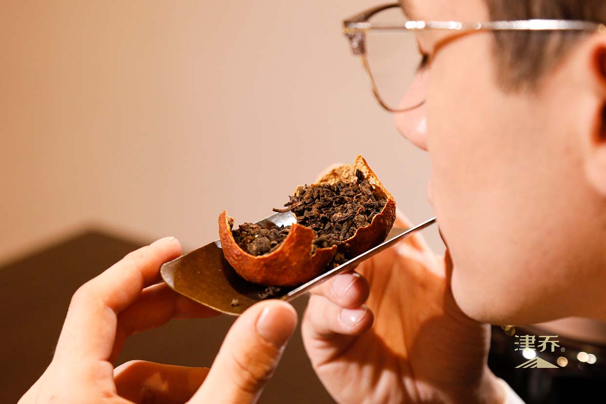 茶的部分,得是陈化三年以上的优质熟普,滋味醇和无杂味。但关键并不只在原料,而在于“茶有茶味、柑有柑香,茶柑相融”的调和艺术。就以“津味大红柑”来说,柑果必须是新会核心产区的成熟大红柑,油室密集可见;熟普也须是津乔珍藏的年份茶料,干净无堆杂味。再经半生晒工艺,让柑皮的清新与熟普的糯香、枣香渐渐交融,形成它特有的“陈醇甘香”。