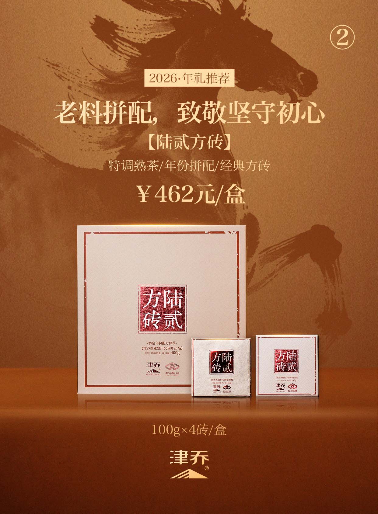 “陆贰方砖”,津乔茶叶建厂60周年出品,由杨国成董事长亲调配方,精选2018-2023年跨五年陈料精心拼配,融汇勐库东西半山风味,复刻经典醇厚口感。经典方砖形制尽显厚重,搭配精致礼盒礼袋,宜品鉴、宜珍藏、宜赠礼。