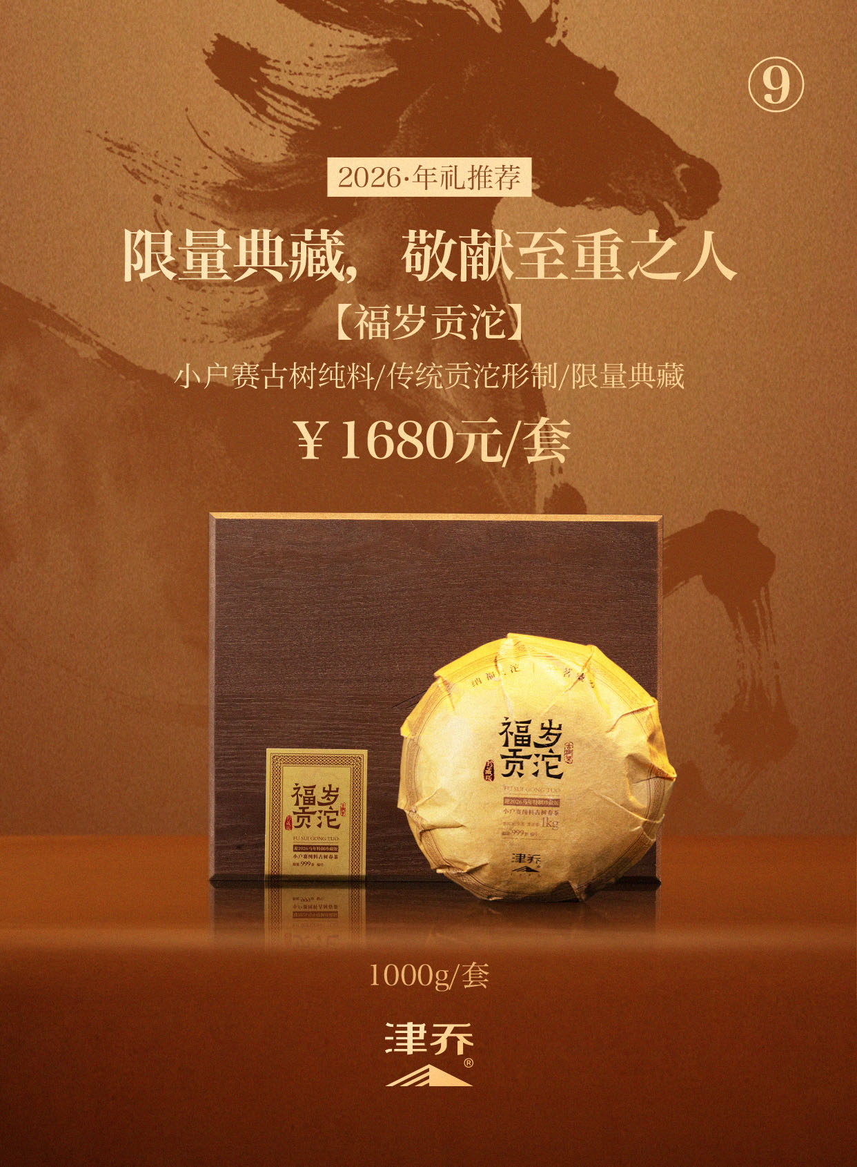津乔九款年味好茶,将名山风土与时光醇化,凝为可品可藏的岁末心意。这个马年,以津乔好茶为媒,敬岁月无恙,贺新春安康。愿茶友们新岁如茶,越陈越香,回甘绵长,福泽常伴。