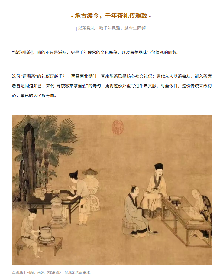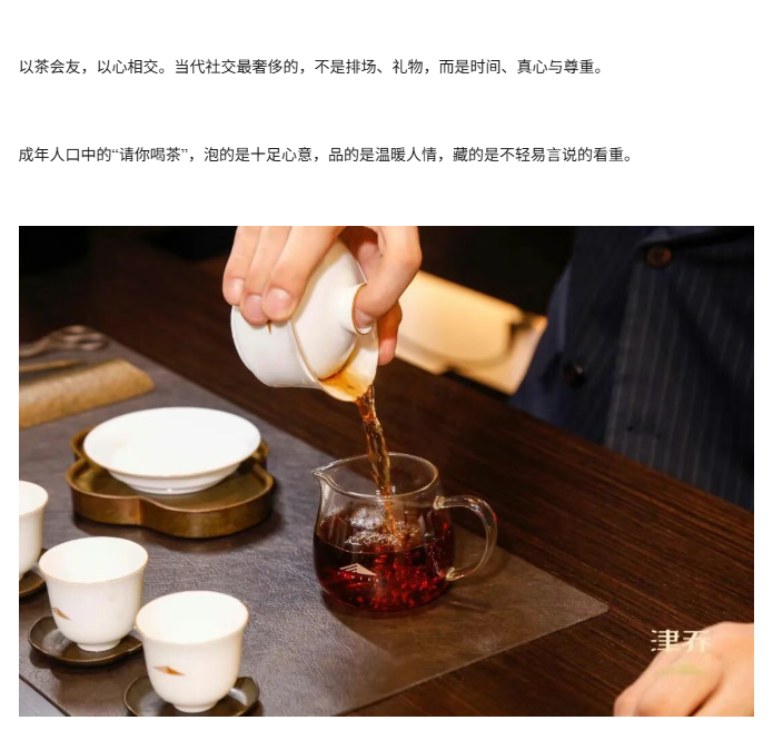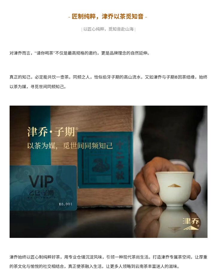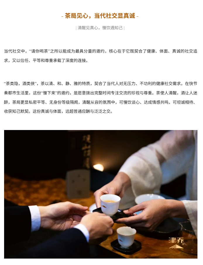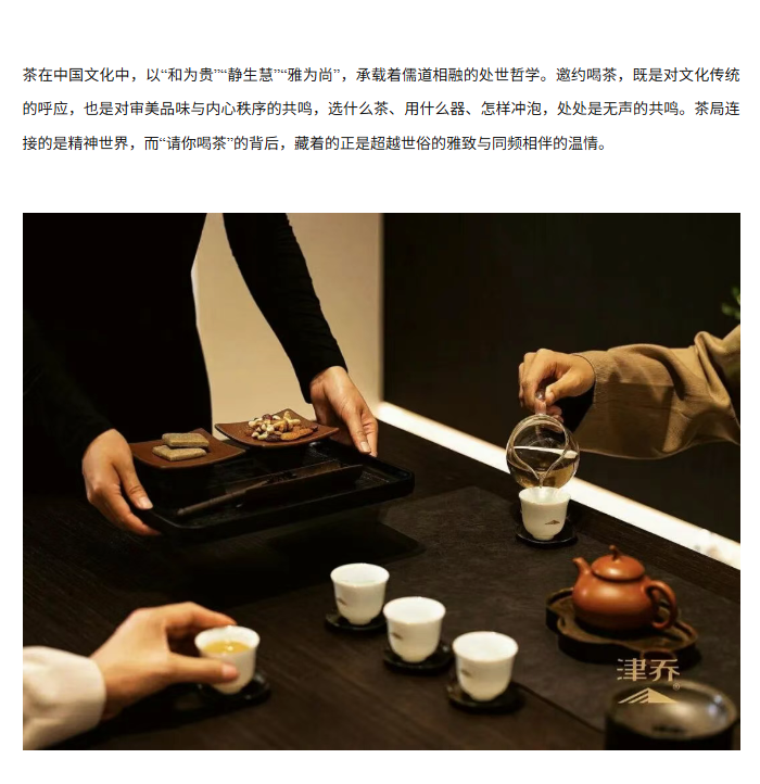 首页 > 品牌动态 > 茶文百科 茶文百科 企业新闻 新品上市 为什么说当代社交规则:请你喝茶,是最高规格的邀约? 2026-03-25 15:26 来源:津乔|匠制纯粹好茶 关注量:107 上一篇:暂无内容 下一篇:岁月承韵,茶香知意,“乙巳·子期®”好礼敬献知音 看完觉得怎么样?点个赞再走吧 已有1人点赞 还不够?分享给朋友 热门推荐RECOMMENDED 25日 2026-03 为什么说当代社交规则:请你喝茶,是最高规格的邀约? 以茶会友,以心相交,知己共饮当代社交的“请你喝茶”承古续今,见心见诚藏着不言而喻的看重 23日 2026-03 岁月承韵,茶香知意,“乙巳·子期®”好礼敬献知音 岁月承韵,茶香知意茶逢子期,香满今春“乙巳子期”好礼敬献知音 20日 2026-03 敢称“金魁”,必有风骨,深入品鉴“冰岛1485·金魁”古树秋茶的香沉韵足。 一杯金魁,半部冰岛冰岛1485 • 金魁🍵500载树龄,单株级谷花诠释香沉不扬,甜润入骨尽显冰岛秋茶高阶品饮质感 19日 2026-03 不看包装,如何通过品饮分辨生普的品质? 不逐虚名,回归本真以味辨质,以汤鉴真一饼上品生普底气,自在茶汤之中 17日 2026-03 经典珍藏,极致分享,津乔4款经典好茶解块装推出 经典珍藏,极致分享极简单泡,岁月陈香津乔四款年份臻品|单泡装焕新上市以极简之式,解锁传世珍味 16日 2026-03 春山在望,茶韵初生,这趟春茶之约怎么赴? 春山在望,茶韵初生探山寻源,匠心制茶品韵知味,藏香待老寻茶而至,共赴春约