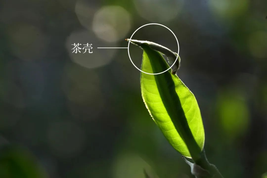 茶壳又名茶芽孢,形似笋状,表体覆盖着一层白色绒毛,触感比嫩叶更硬挺,是嫩芽冬季修养蓄势的保护伞。春季到来后,茶芽奋力生长后将茶壳顶起、脱落,但在头采时偶尔也会一并摘下。冲泡表现出类似茶梗的甘甜味道。