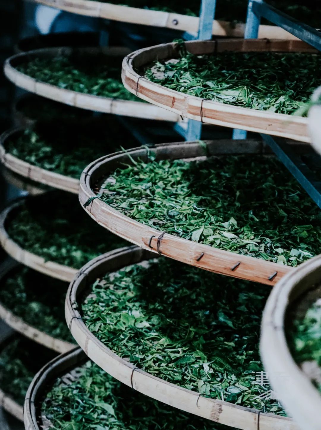 结束了一天的采摘工作,刚运输回来的的鲜叶正在被津乔匠人们摊晾在车间里,准备进行快速杀青。