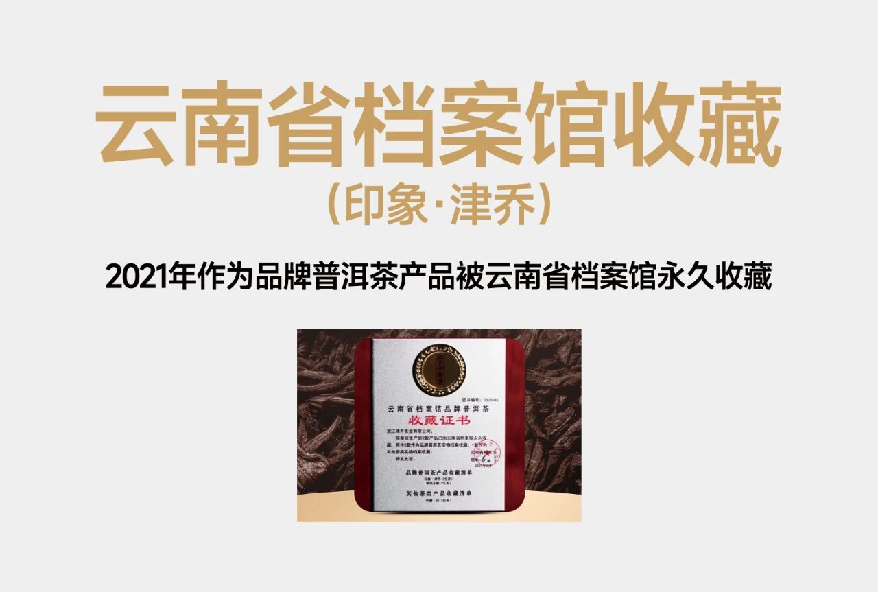 2021年,津乔以“高标准、重份量”推出“印象(旱春尖特制版)”,并延续经典“整提+散茶”包装,更体现茶品的标杆属性。同年,茶品作为云南省档案馆品牌普洱茶实物档案被永久收藏。