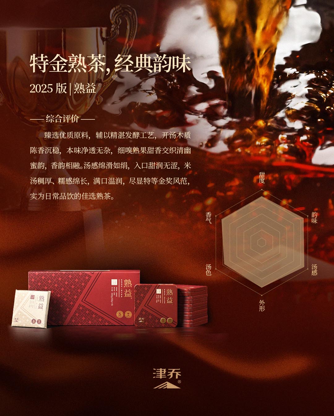 当下,茶友对“好的日常熟茶”的期待愈发明确:质价比高、冲泡简单,喝起来温润适口,适合长期饮用,还能收藏。在如此明晰的期待下,津乔熟益®以标杆之态,给出了最佳标准。