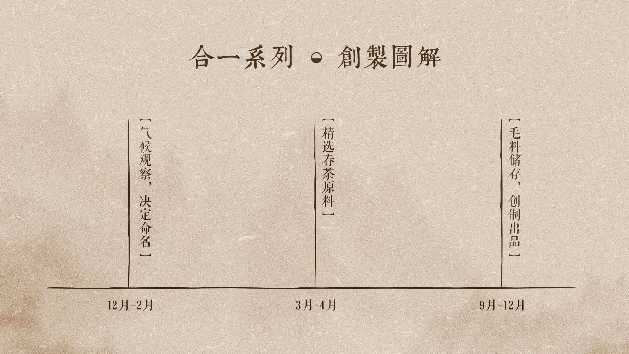 从癸巳年(2014年)起,津乔每年都会密切关注冬春之交(12月-2月)这一时段的气候特征,以此来决定合一新作的命名。随后在春茶季(3-4月)精选高品质原料,经过半年毛料储藏,散去青味,直至下半年(9-12月)正式出品。