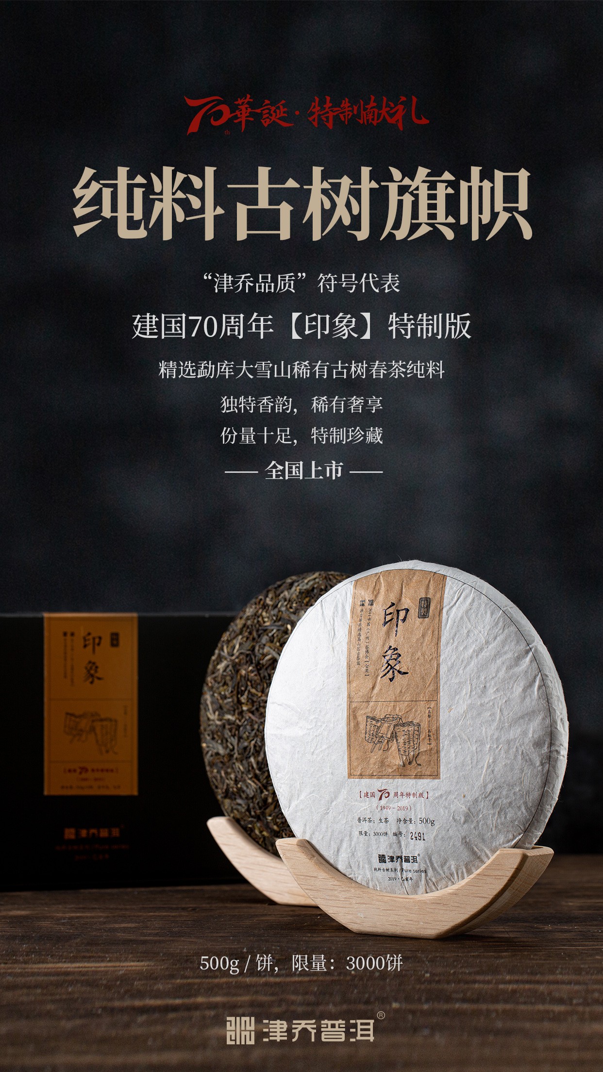普洱茶的精髓在于品与藏。为庆贺祖国70华诞,津乔特别献礼,隆重限量推出印象、百年老树(生茶)、百年老树(熟茶)“建国70周年特制版”共3款精品,并于今日全国同步上市发售。